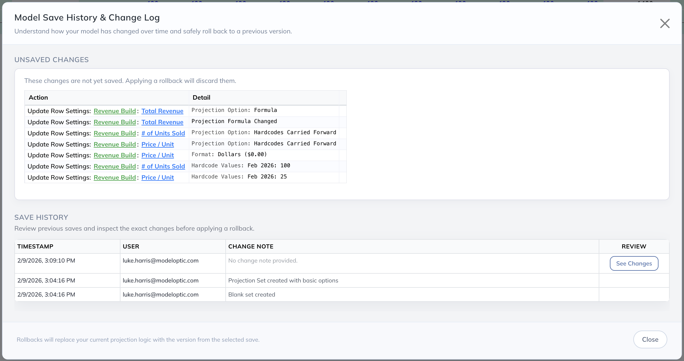 Under the "Save History" section, you can see every save that has been made within the active projection set. Clicking on any of the "See Changes" buttons shows a screen that looks like this: