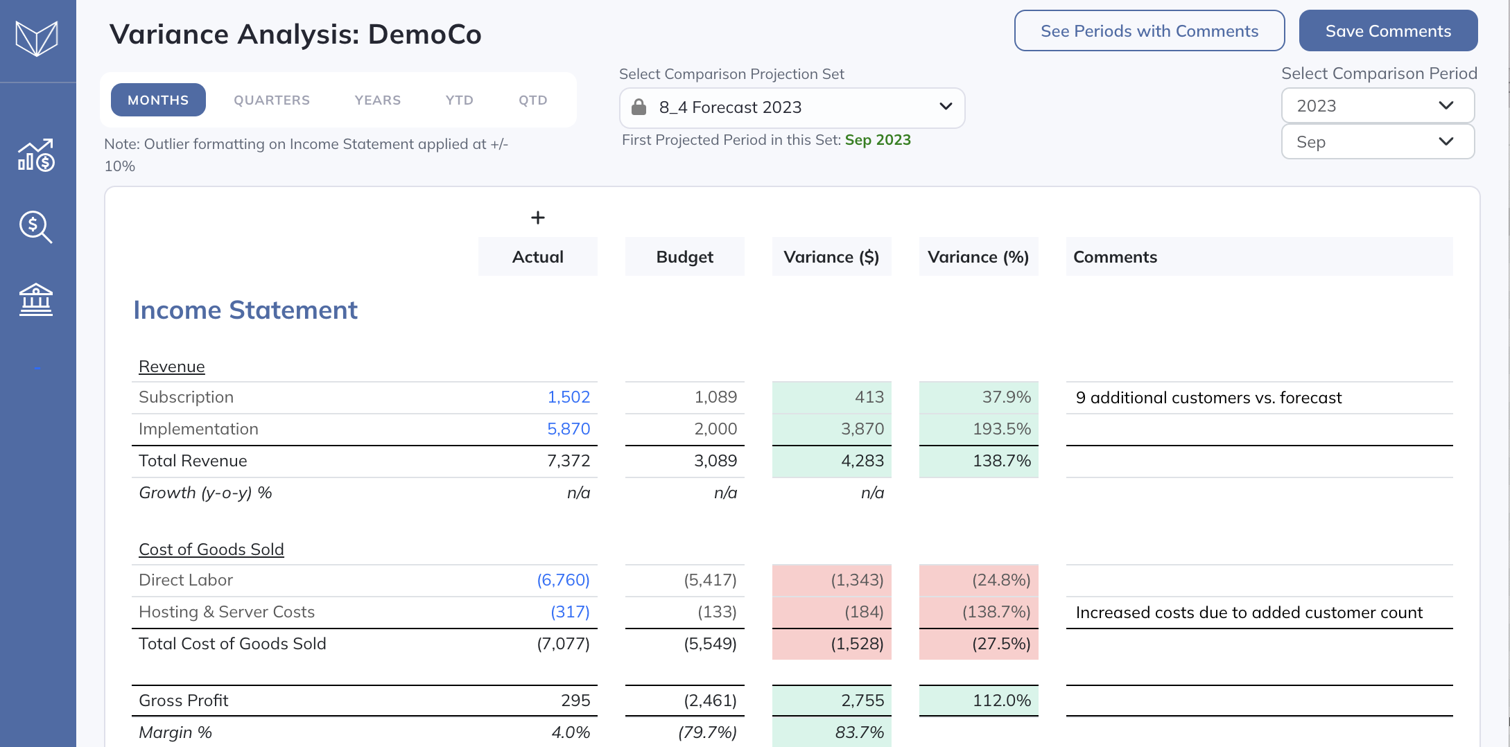 We currently have direct integrations with QuickBooks, Xero, NetSuite, and Sage Intacct (with more to come soon), which makes it very quick and easy to pull in your latest actuals easy month.