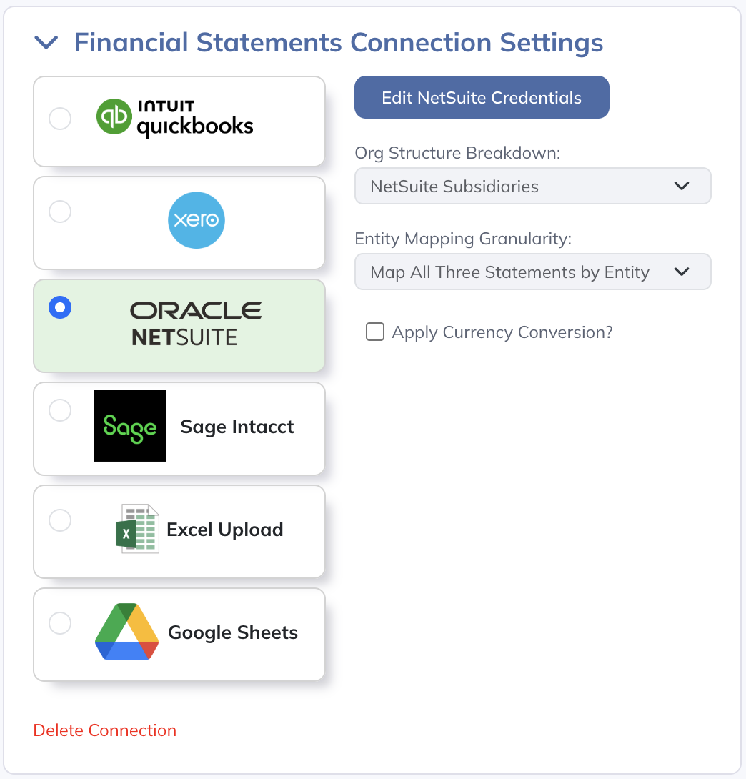 Log in to Modeloptic, navigate to the Historical Data page for your company, and click into your NetSuite Data Connection. You should see a section that looks as follows: