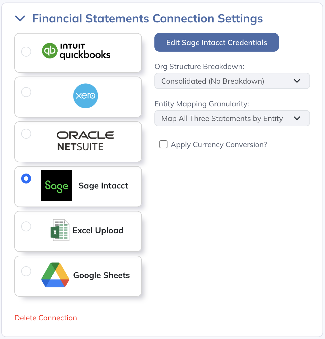 Log in to Modeloptic, navigate to the Historical Data page for your company, and click into your Sage Intacct Data Connection. You should see a section that looks as follows: