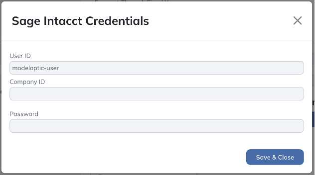 After finishing the "Create a Web Services User" step above, you should have received an email that shows your Sage Intacct Company ID and Password for the Web Services User that you created. Enter those here, and click "Save & Close".