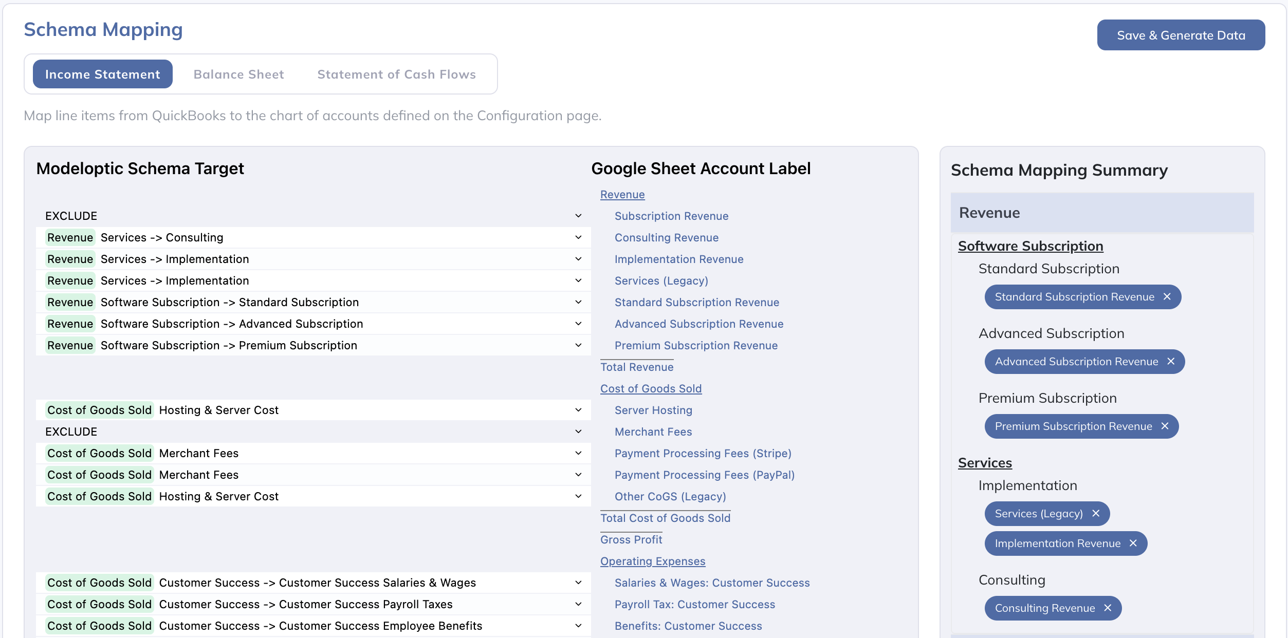 Once you've finished mapping all of your line items, click the "Save & Generate Data" button: