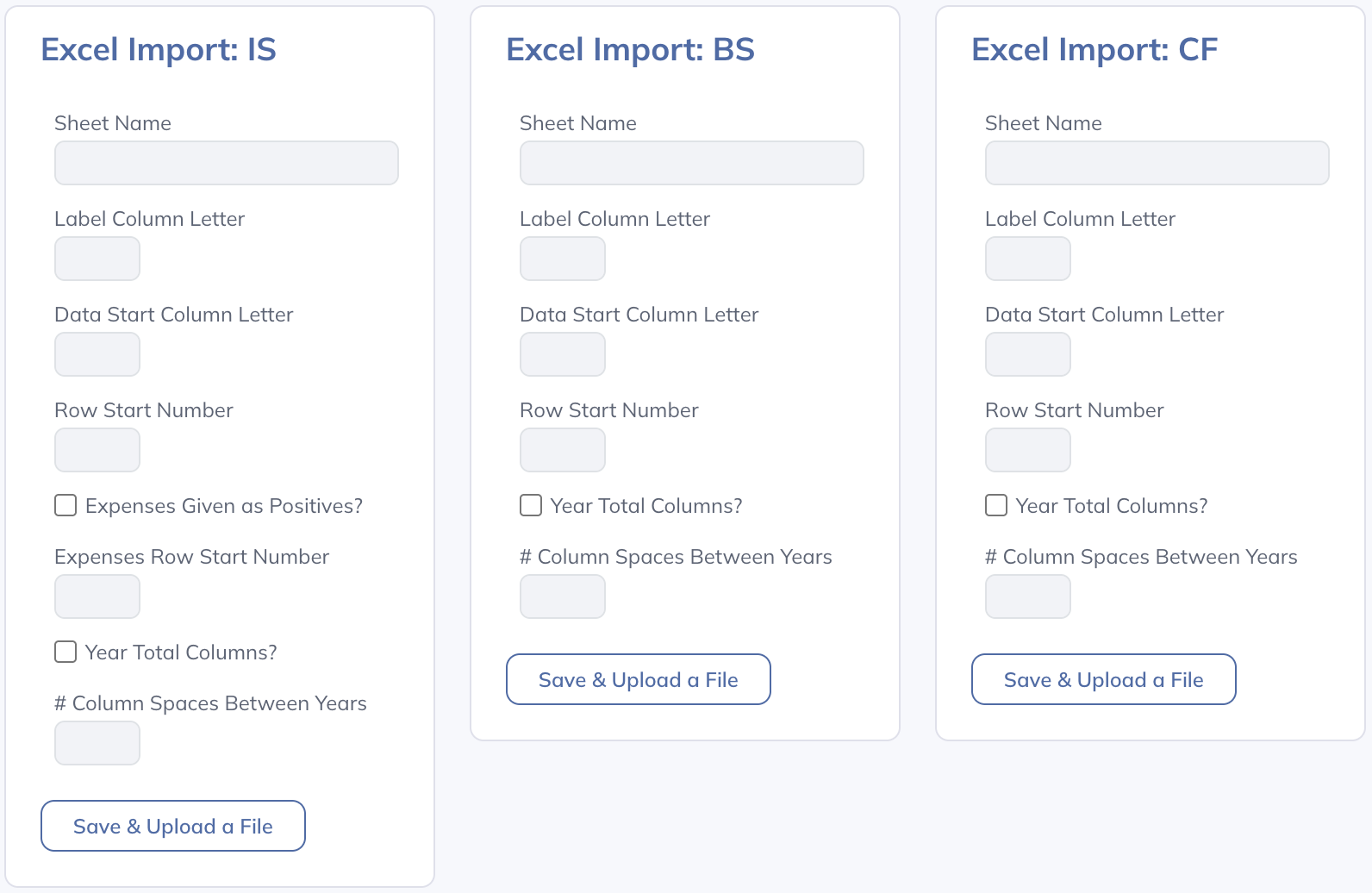 - Sheet Name: The name of the sheet in the file you're uploading that should be imported for the given financial statement.