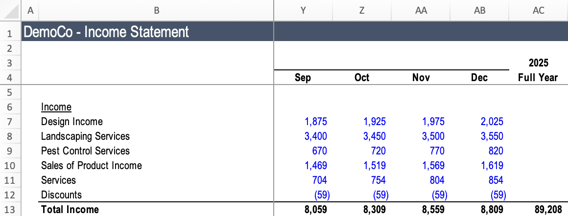 Each line item can be forecast either via built-in options (like % of revenue or trailing average) or via custom logic.