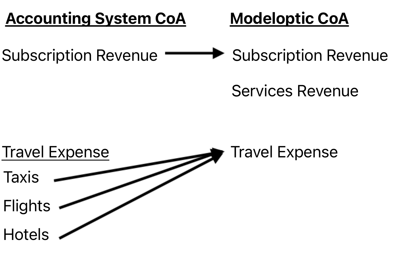 Companies will often have a higher level chart of accounts for the sake of forecasting and reporting versus a lower level chart of accounts within their accounting system. For example, in your accounting system, you might have lines for "Taxis", "Flights", and "Hotels", but in Modeloptic you might only want a single "Travel" line.